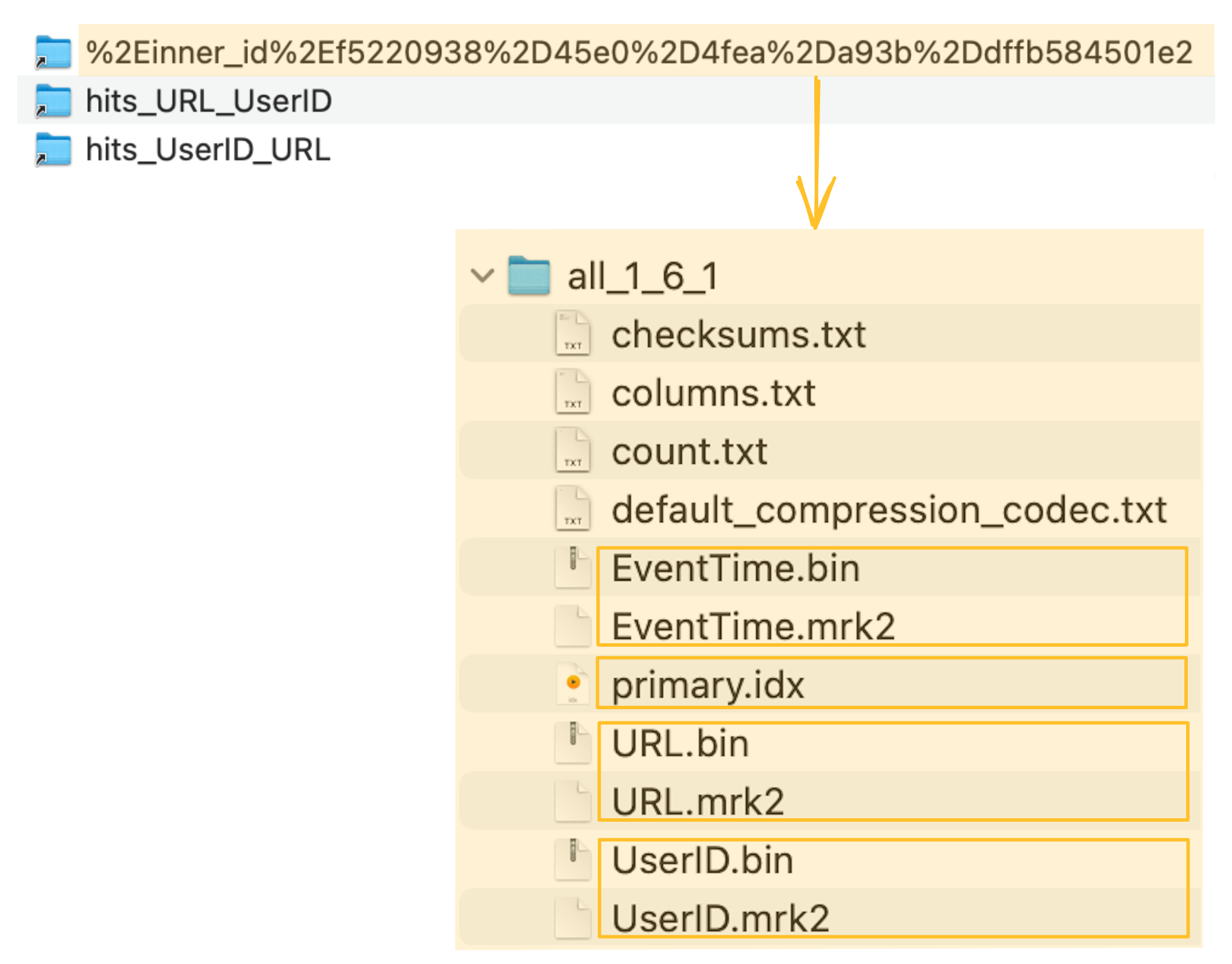 The following diagram shows the three mark files UserID.mrk, URL.mrk, and EventTime.mrk that store the physical locations of the granules for the table’s UserID, URL, and EventTime columns.